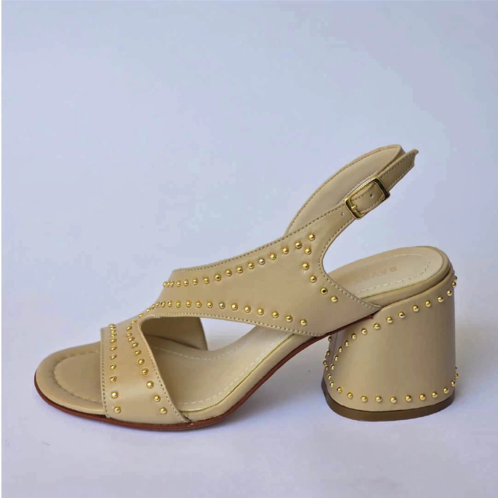 Sandalia "Calpe": estilo y audacia en cada paso. Confeccionada en cuero natural de alta calidad, esta sandalia destaca por sus tachas metálicas que le dan un toque moderno y sofisticado. Su taco circular de 8 cm aporta altura y elegancia, ideal para lucir en cualquier ocasión.